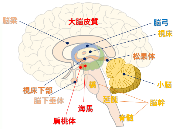 脳にはいろいろな部位があり、その中でも記憶を司る脳の主な領域としては、大脳皮質、海馬、扁桃体があります。