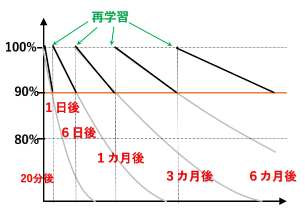 記憶学習のタイミングは、もちろん学習内容や個人差によっても違ってくるのですが、節約率90%が理想的であると言われています。
